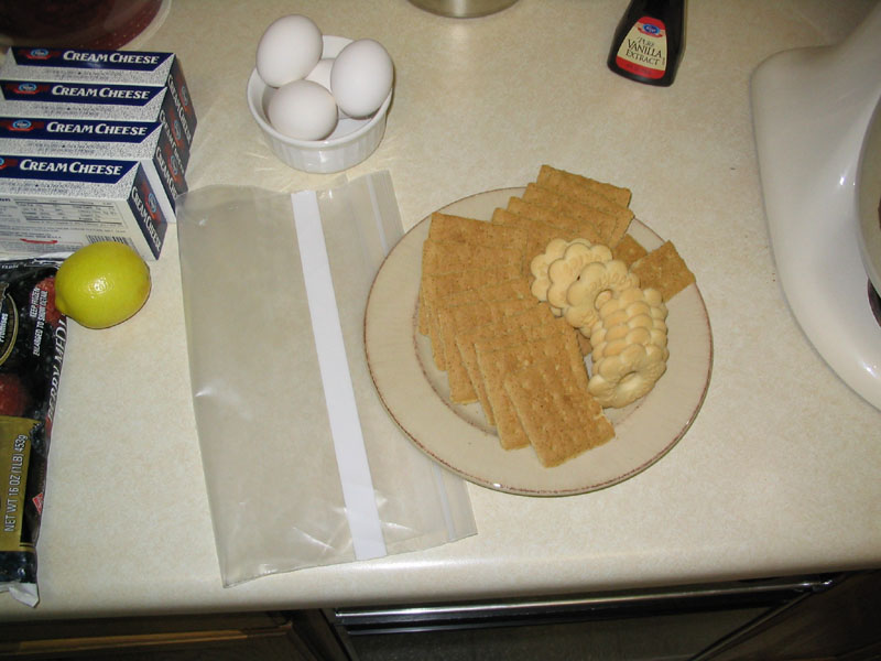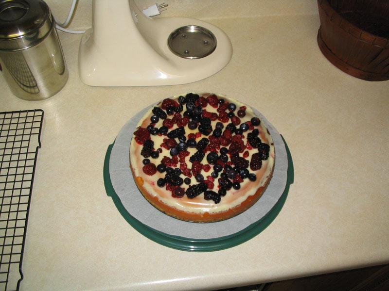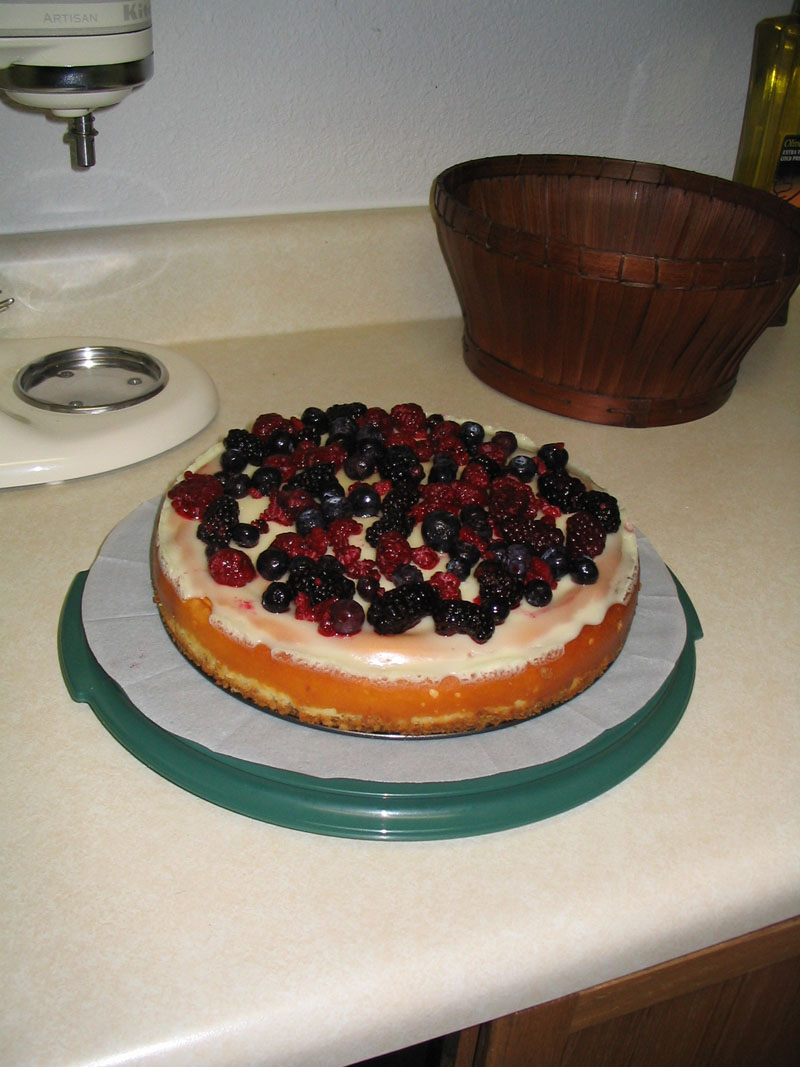 This is a recipe for 3-berry cheesecake with a sour cream and vanilla topping. It's delicious - mostly because it's got enough fucking saturated fat to kill you about 10 times over. Speaking of which, this cheesecake will serve 10.