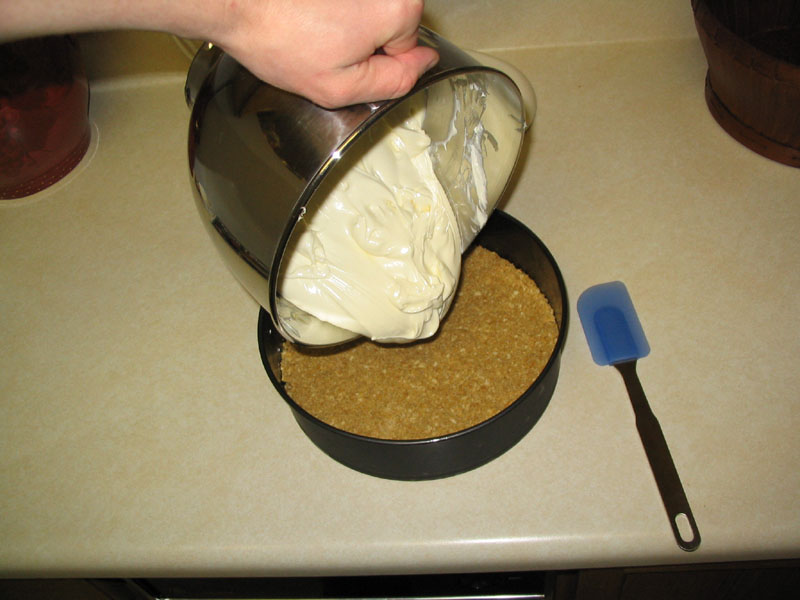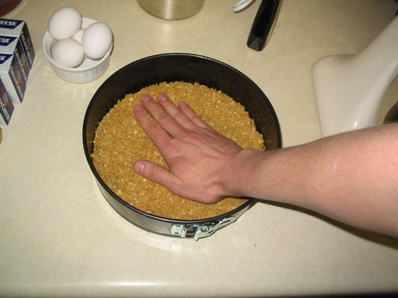 Pack into the bottom of the greased springform pan. I'm using a 10" pan with 3" sides. Place the pan and crust into the freezer.