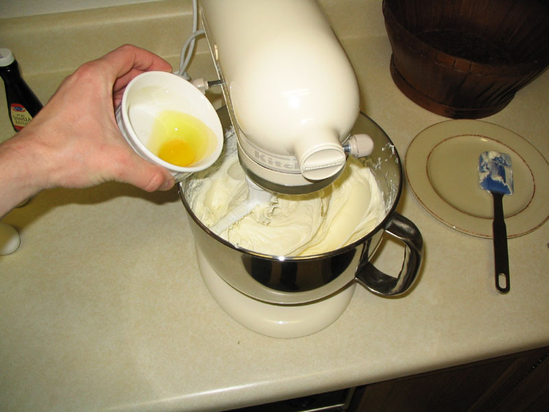 Add the eggs ONE AT A TIME. Mix 30 seconds or so and scrape the sides of the bowl down between EACH egg or the top of your cheesecake will have cracks.