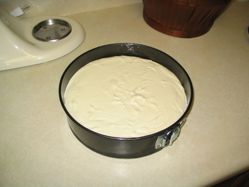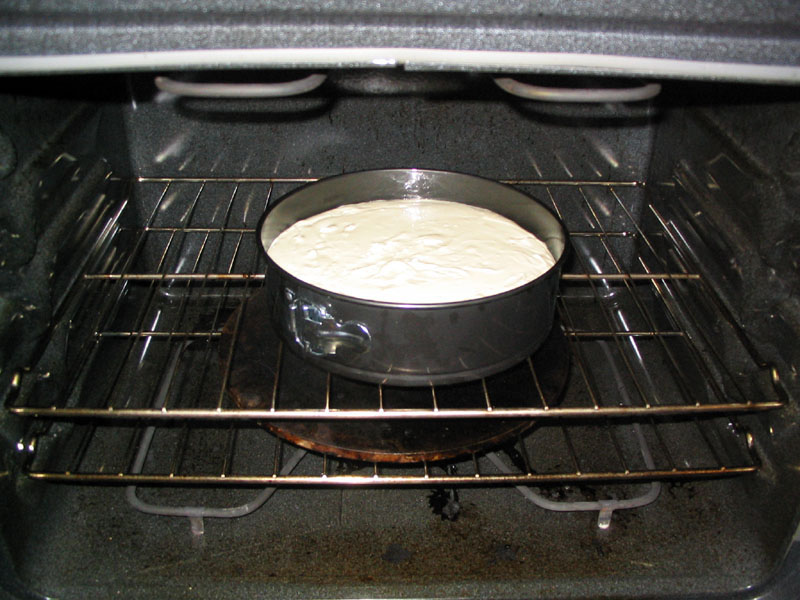 Put it in the oven. You don't need to worry about all that fancy waterbath shit for this cheesecake. Note the incredibly well used pizza stone; your pizza stone helps even out oven temperature and should always be inside.