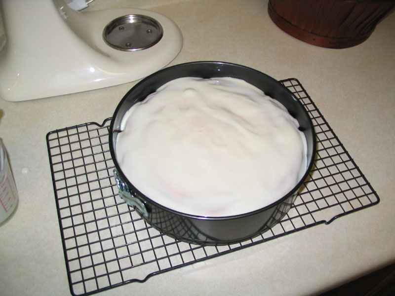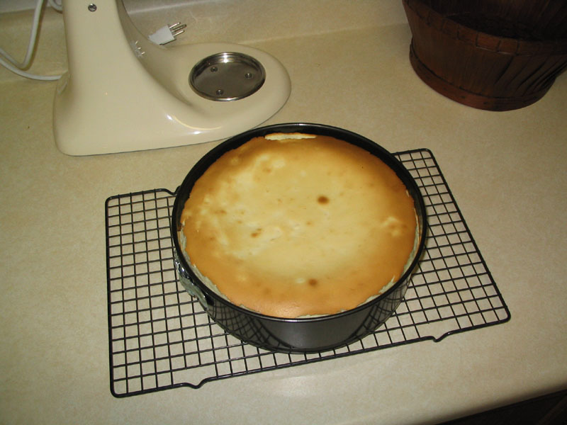 Remove the pan from the oven and cool for 10 minutes. Leave the oven on. The cake will fall slightly as it cools. (Note: this cheesecake is very slightly overdone)