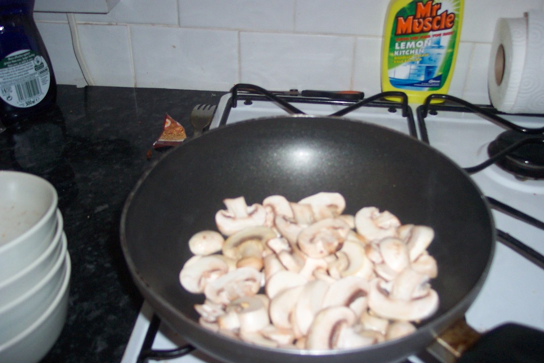 Wash and slice the mushrooms - don't be too picky, that's what your immune system is for! Mince the garlic and then fry it all in hot oil or ghee. You're really meant to have half onions and half mushrooms, but I couldn't find any onions, so just pretend we've added half and half.