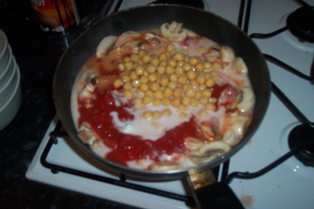 After you've fried them for about 5 minutes add in the tins - I like my curry thicker than most so I only add 2/3 of the Coconut milk. It'll look something like this: