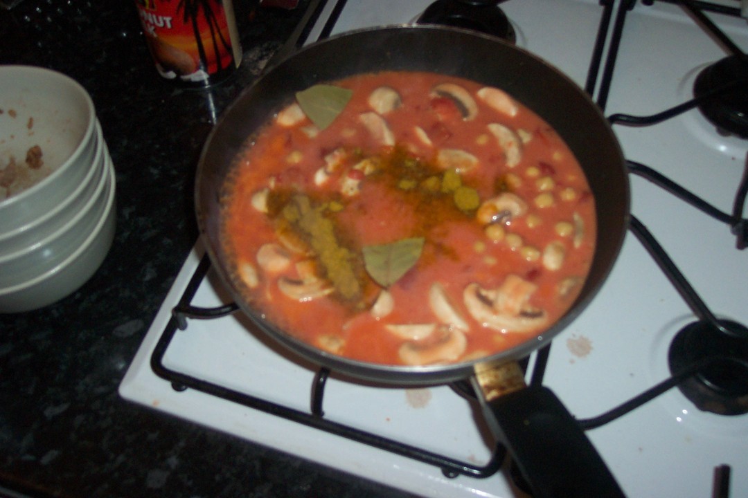 Yum! Now, mix it up, then add the curry powder and bay leaves. You don't have to , and most of the time I don't bother - but it makes it taste more 'ethnic'. It's at this stage you can add Cayenne Pepper, Chilii Powder or crushed dried chillis for a bit of a kick - with something as subtle as this curry though, I don't normally bother.