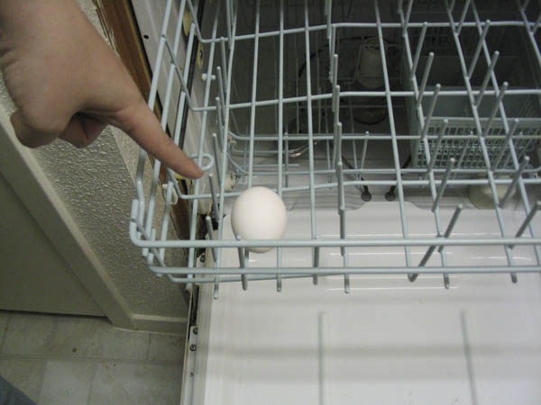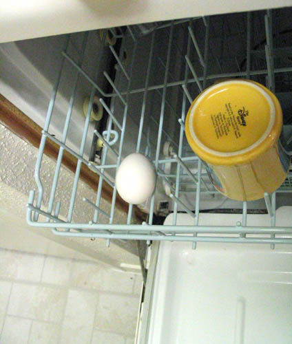 My lovely dishwasher. I put the egg in the top rack as shown above (no mug this time), set the dishwasher to "light wash" with heated drying on, turned it on and left the house.
