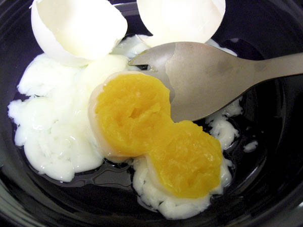 It's not hardboiled but it's not raw, either. I'd call it softboiled if I knew what that actually entailed. I've never cooked them that way on purpose.