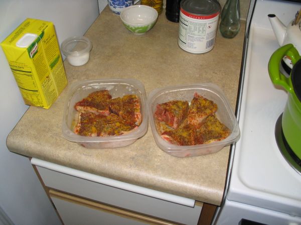 I went in search of lamb shanks since I've cooked them before, but there were none to be had at the store, so I went with these. I don't even know what these are. Chop tips or something. They seemed to be a decent cut though, so I went with them. Season them with some curry, ground thyme, dill, ground black pepper, cayenne pepper, and paprika. It's been hanging out in the fridge for a few hours.