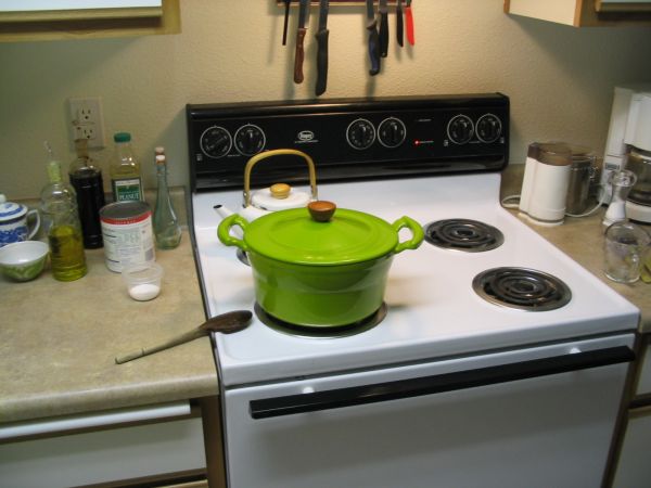 Next we get our sauce ready on the back burner there. It's a 28 oz can of tomato sauce and 1 cup of chicken stock. It's seasoned with a little salt, paper, and some oregano. It's just getting warmed up, not really reducing it. In front there is a 5.5 qt enameled cast iron Dutch oven with some olive oil getting hot in it.