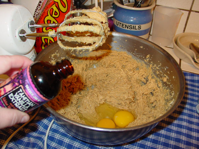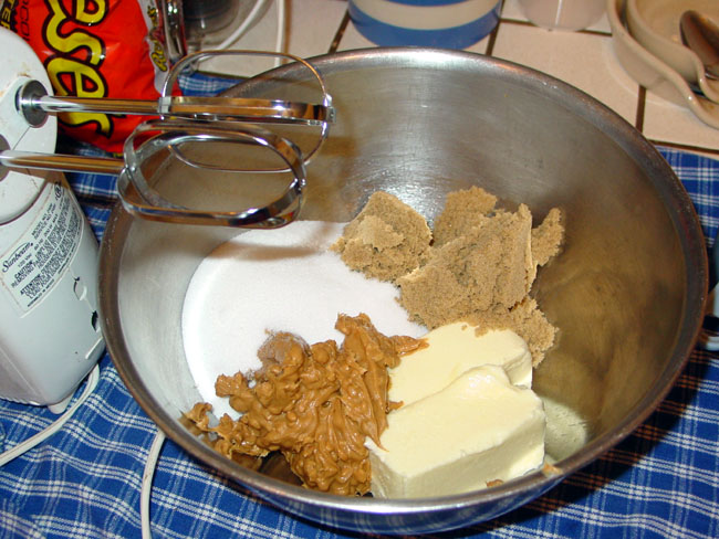 In a large mixing bowl, beat butter and peanut butter until well mixed. Add both sugars and beat until fluffy.