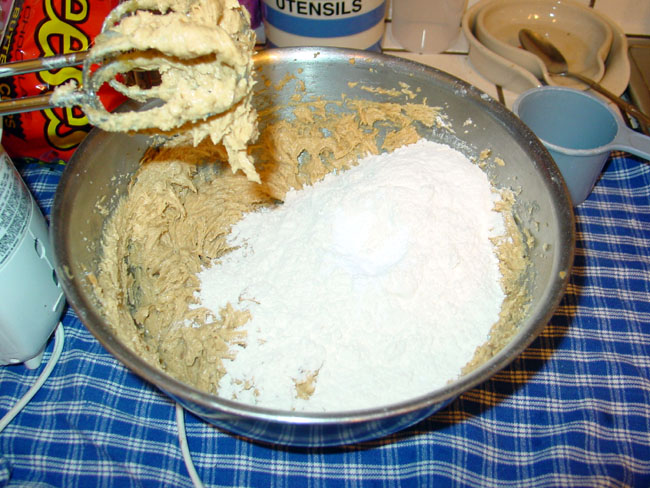 Stir in flour and baking soda, mixing well until stiff dough is formed.