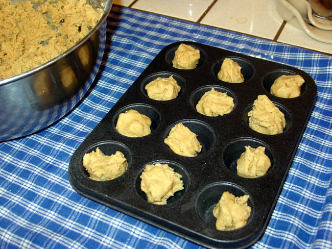 Roll dough into 1 inch (2.54 cm) balls and place one ball in each muffin space in the muffin tin.