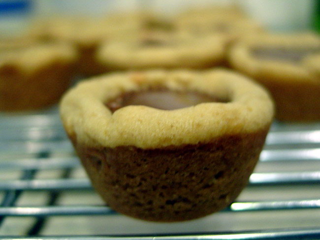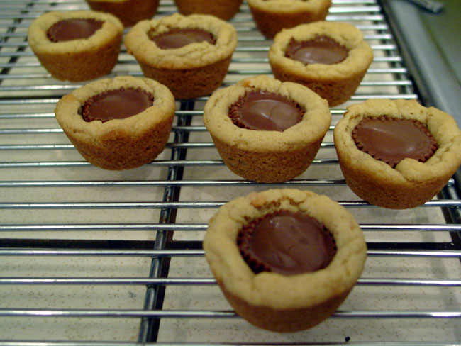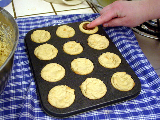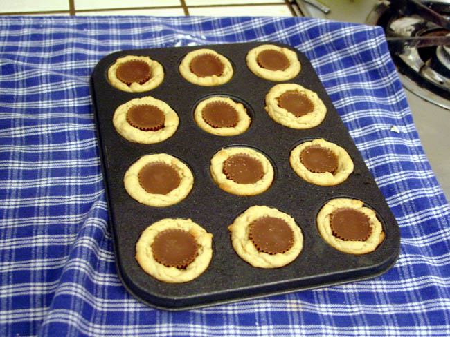 Immediately after removing tin from oven, push one peantut butter cup down into the top of each cookie, jamming it down into the heart of the cookie until the peanut butter cup is even with the top of the cookie.