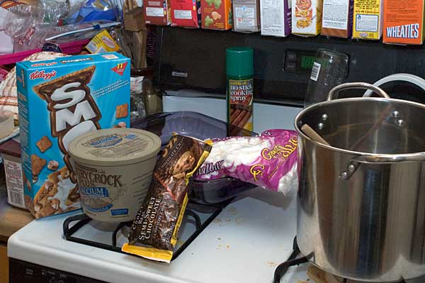 You also need a pot, a pan to put the stuff in after it's all mixed (I use a 13x9 cake pan), and some non-stick cooking spray to put in the pan so your treatz don't stick. Also, a utensil of some sort to stir while you're cooking.