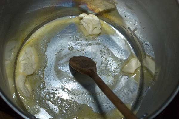 Put the pot over a low flame and throw your butter-variant in. Stir it around so the whole bottom of the pot is coated.