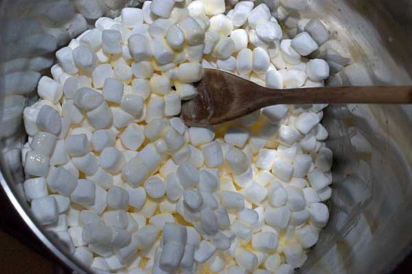 Once the butter is melted sufficiently, add the marshmallows. Stir your marshmallows and melted butter around, and for pete's sake keep stirring so your marshmallow goo doesn't burn!