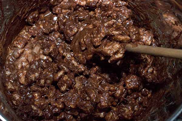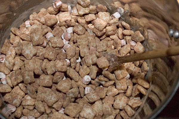 Now you can turn off the stove and add your Smorz cereal. Just go ahead and dump the whole box in, and start stirring pronto while your goo is still hot.