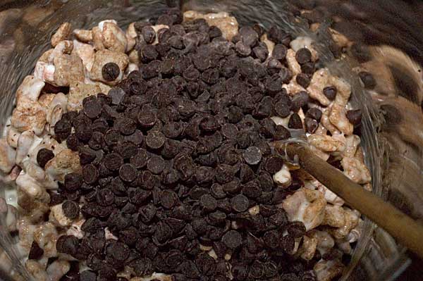 Once you've stirred the cereal a bit, add your bag of chocolate chips. Keep stirring! You're almost done!