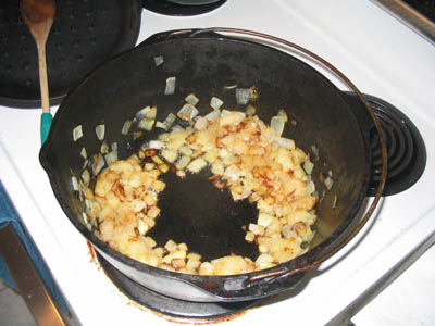 Next, we’re going to cut up a couple of yellow onions and cook them in some corn oil until they’re a medium shade of brown.