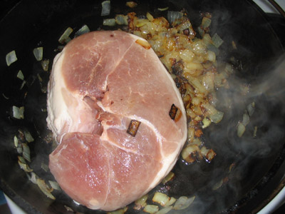 Now we brown the pork a bit, just to get that little bit of extra flavor. You can just scoot the onions to the side for this, they’ll be fine.
