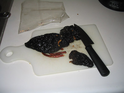 We’re also going to chop up about five ancho chiles (taking out the stems and most of the seeds) and a few arbol chiles and toss them in. You should get the chiles into cornflake-sized pieces. I find that scissors are far more efficient than a knife for this. However, I’ve shown the chiles with a knife here just to confuse you.