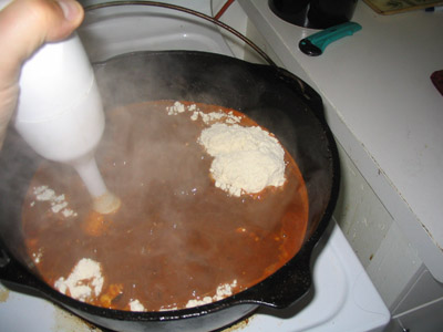 But wait, what about that chili sauce I promised? All we have to do for that is to put the Dutch oven on the stove top and give it a bit of a boil. Once it’s cooked down until the flavors are the right strength (which will be anywhere between ten seconds and thirty minutes, sample often and carefully) we toss in about a cup of the Maseca flour and hit the whole mess with a stick blender. Blend the crap out of it until it becomes very smooth and tasty looking. Turn the heat off and let it cool; it will thicken as it comes down in temperature.