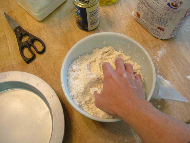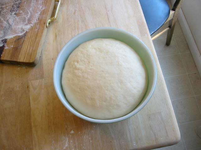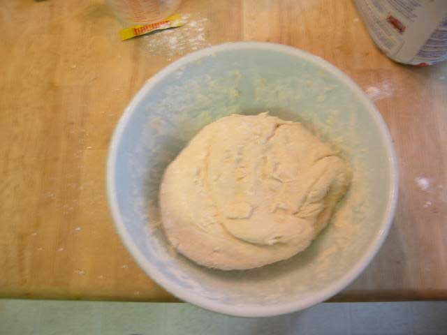 After pouring in all the yeast mixture, Knead the dough in the bowl with one hand until there is no more loose flour laying in the bowl. It should look like this at this point: