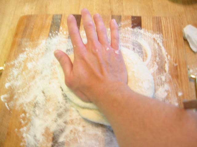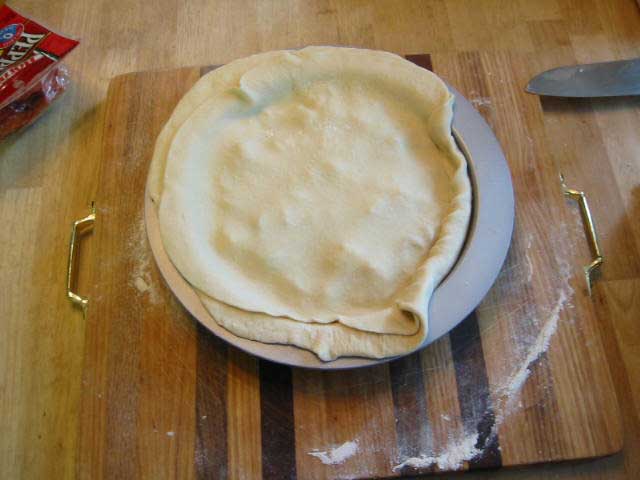 Ok, cut the dough in half and set aside one half. Each half makes one pizza. Take the half you just cut and cut off 1/3 of that half. Set that aside also - it will become the top crust. Now take the piece you have left and roll it into a pizza shape on your floured cutting board. It should be large enough so that the edges reach over the top of your cake pan.
