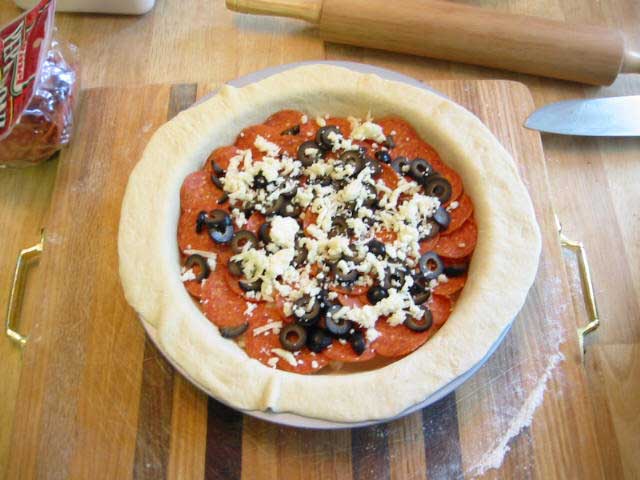 Pepperoni and olives are always a good choice. If you are feeling experimental, spinach and feta cheese go really well with a stuffed pizza. I was just too lazy to go to the store to pick some up. One other note, if you want to put sausage or ground beef in your pizza, you must pre-cook them in a skillet before throwing them in the pizza. Otherwise they probably won't cook all the way through, not to mention they won't be browned at all.