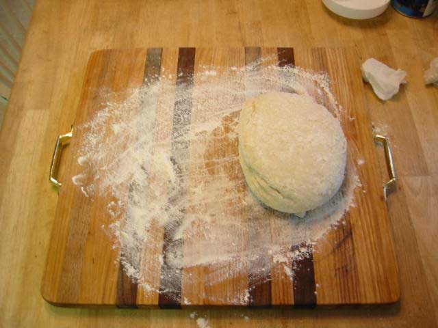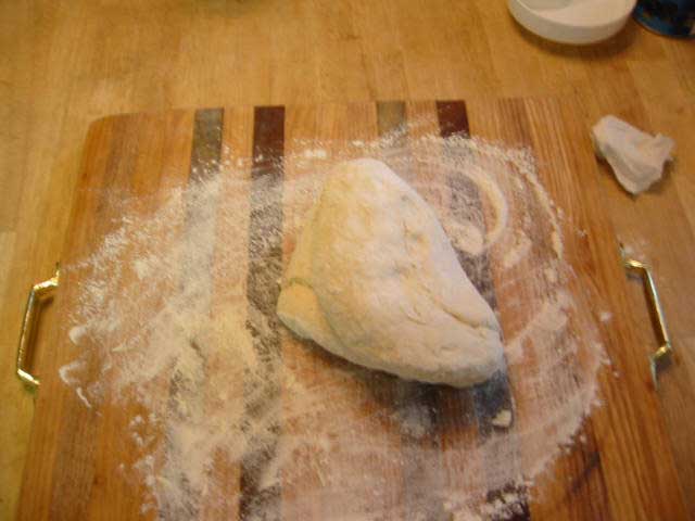 At this point, you are ready to start kneading the dough in earnest. Dump the dough out onto a lightly floured cutting board like so: