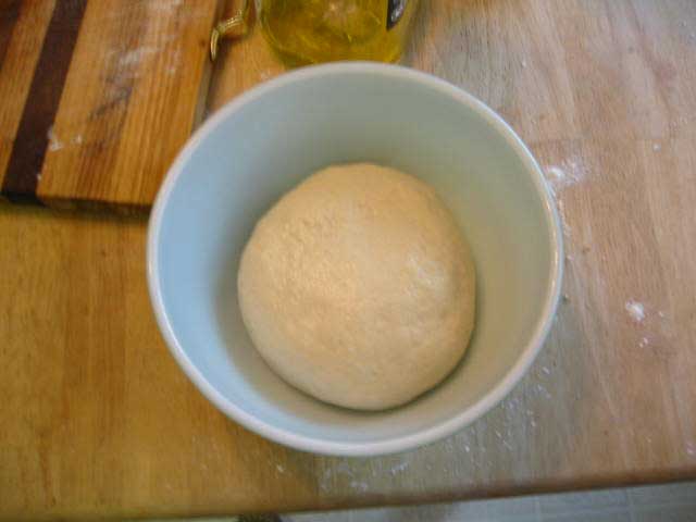 After 10 minutes are up, lightly coat the dough with olive oil (just put some oil on your hand and rub it all over the dough) and throw it in a clean bowl. It should look like this:
