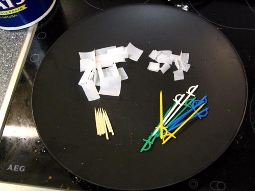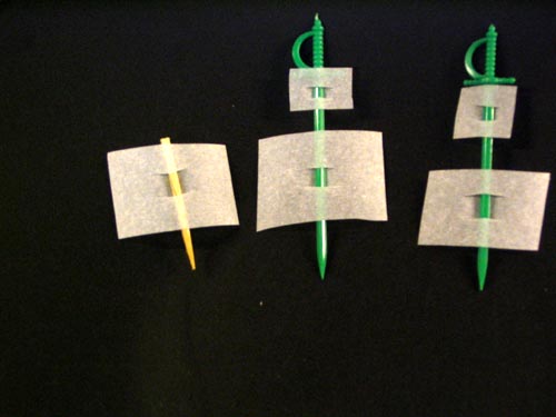 And chopped up a bunch of parchment paper into two sizes (small and large sails) and cut the toothpicks in half, discarding the non-pointy ended half.
