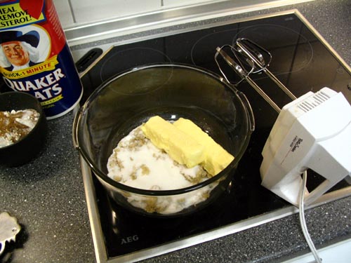 Beat together margarine, brown sugar an' granulated sugar until creamy.
