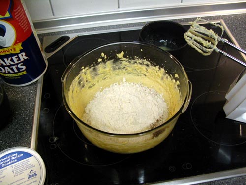 Add flour, bakin' soda, cinnamon an' salt; mix well.