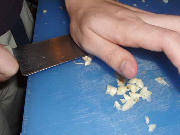 Begin cutting up the garlic, you can easily get the white outer shell off by cracking it with the side of your knife. Chop up about 4