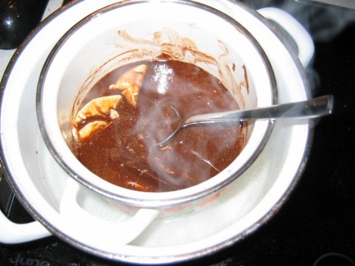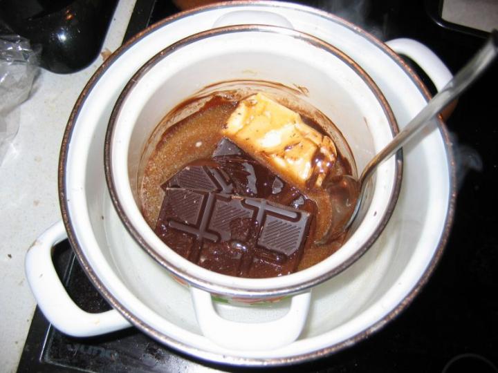 Fill about 1.5cm (1 inch) of water into the bigger pot and put on oven. Put small pot in big pot. Put butter and chocolate in small pot.