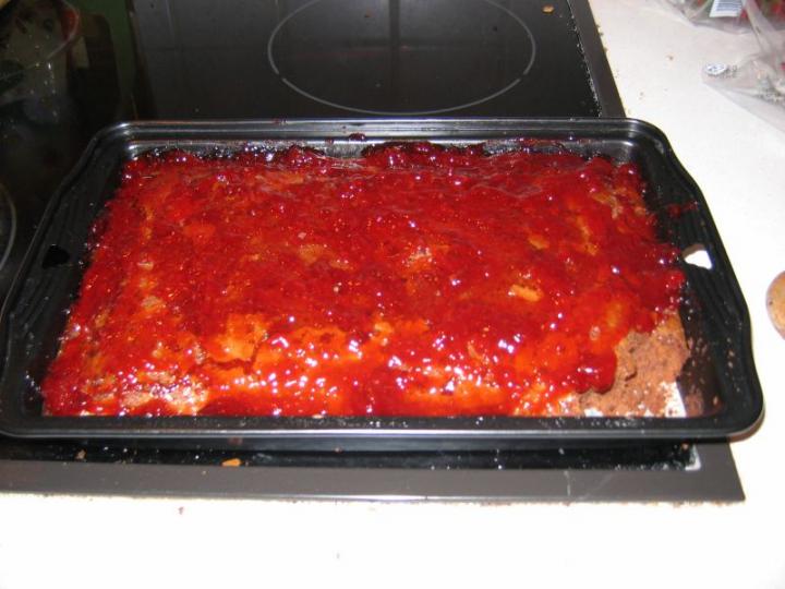 It's important to let the brownies cool before you put the strawberry jam on top. This is, to prevent the jelly and strawberry juice from diffusing into your brownies and making them all mushy and gross, so, jam goes on top...