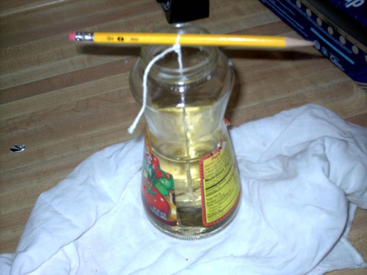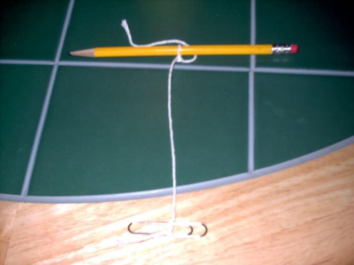 Ok after you've gathered all of your supplies, next comes the prep phase. Before mixing anything here is what you need to do to assemble your HI TECH crystal candy maker. First, you will want to cut a piece of the string that's a little longer than the glass is tall, just to make sure you'll have enough length to tie the knots. Second, tie one end of it to the middle of your pencil. Third, tie the other end to your paperclip. When done hang this in the jar, the string shouldn't touch the bottom. If it does, untie and retie it till it's the correct length.