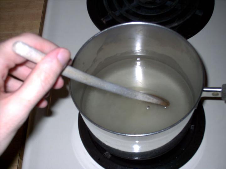 This is where you use that candy thermometer(if you have one). You'll want this to be about 240 degrees F to ensure maximum dissolving power. If you don't have one, just do what I did and use your hand. If it burns off your flesh, it's hot enough. If you're a pussy though you can just guess. A good way to tell is by letting it come to a boil again once the sugar is added. When done you'll have this. This would be a good point to add any food coloring or flavoring that you intend to have in the final product.