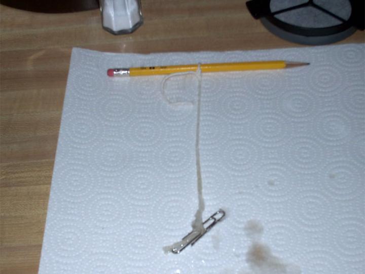 Next time I may just dunk the string in and THEN tie it to the paperclip once it's dry, so that I don't get a mass growing on the weight itself.