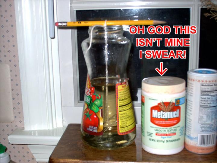 FOR SCIENCE! The process behind this creation is quite simple. When heating up the water it of course increases it's capacity for dissolving shit, mostly sugar in this case. When it cools that sugar needs a place to go and starts forming crystals. If there's dry sugar in the jar at the time then an already existing crystal is a natural place for the growth to start. Most people just wet the string and pat some sugar onto it but oh no, we're more manly than that. That's why we dunk the whole thing in, then take it out and let it dry. Over the period of a few days your crystal will gain size. The longer you wait, the bigger it gets.Next time I may just dunk the string in and THEN tie it to the paperclip once it's dry, so that I don't get a mass growing on the weight itself.