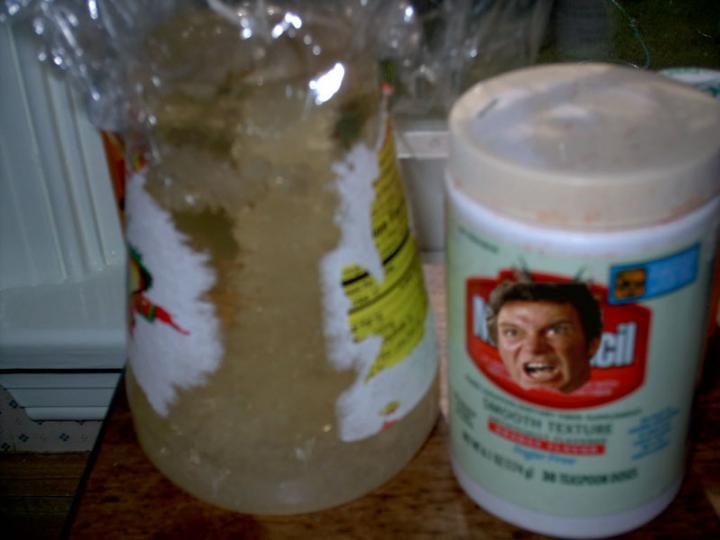 WARNING! DO NOT DRINK! This stuff is VERY hot and can cause massive burning if spilled, and spill it will if you're not careful and crafty. Make sure to pour it in in small amounts at a time, so you don't crack your fancy jar like a bitch. When it's all poured in it should look like this.