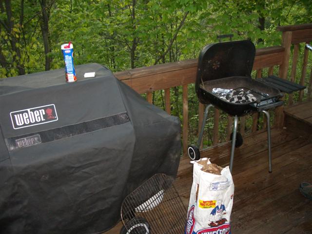 Get your charcoal in a nice pyramid and let it all turn grey. Note the unused gas grill....