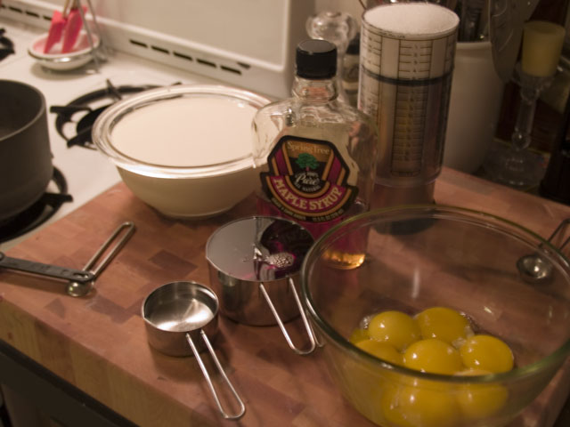 Let that sit for about 10 minutes, and then pour your maple/cream mix from the fridge in it. The hard sugar coating should be higher than the level of custard in the pan.