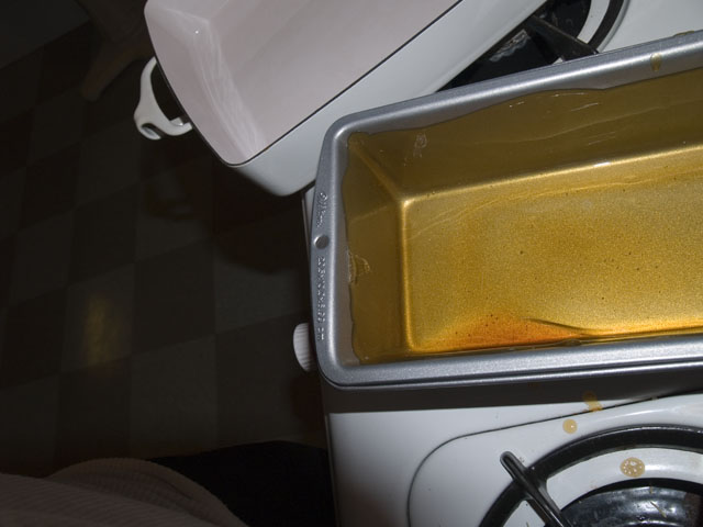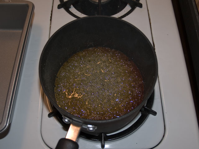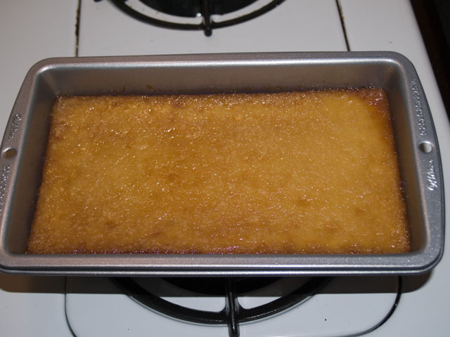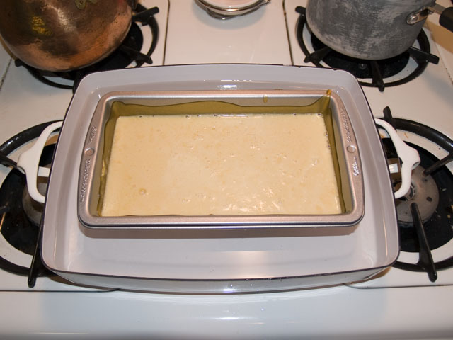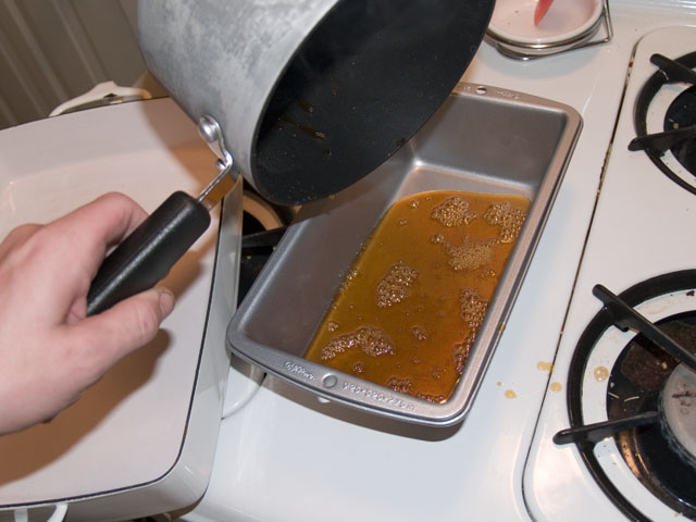 About 30 minutes before you bring it out of the fridge, mix your sugar, water and corn syrup in a saucepan over low heat, simmering until the sugar dissolves into the water. You will know that this has happened when the mix is pretty much clear. After the sugar has melted, turn your heat to high and bring the liquid to a rolling boil. Do not stir, just every once in awhile swish the pot a bit. After about 5-8 minutes, it will become a deep, golden brown. This means that the sugar has caramelized. Pour this immediately into your loaf pan, and carefully tilt the pan to coat all sides, as close to the top as you can get.