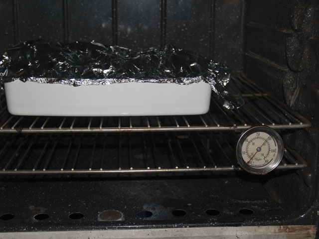 Put this in a 300 degree oven for 1 hour, 45 minutes. Then increase the temp to 345, take off the foil, and cook for another hour, uncovered, or until it looks like this;