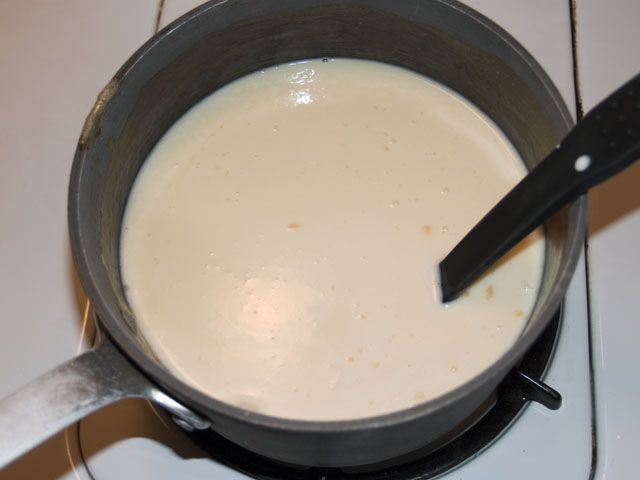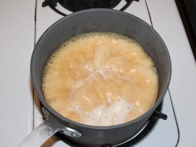 Keep your heat low, it will want to boil over. When it's finished, reduce the heat, and slowly stir in your whipping cream, and bring it back up to a boil.
