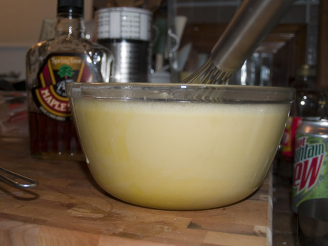 Whisk your eggs, and while the cream/syrup mixture is still nice and hot, pour it into the egg bowl slowly while whisking like crazy. Add your salt. It should look like this;