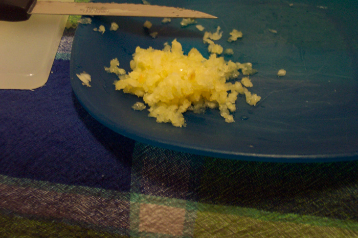 Then, slice the onion. I forgot to take pictures, so lets move on the the garlic. Peel as many garlic cloves as desired. I did four.