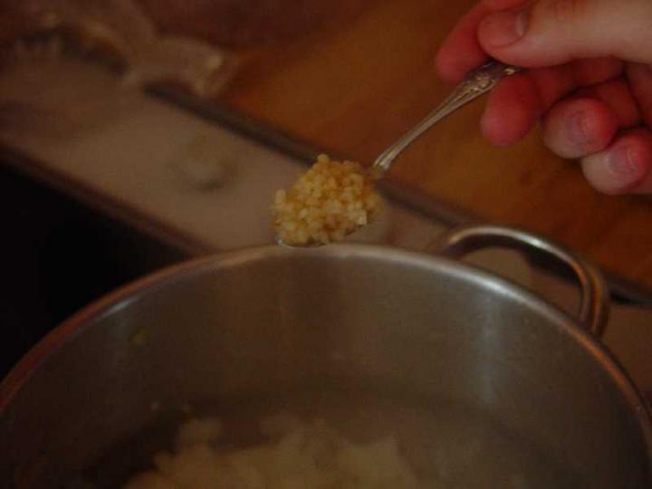 Now that your onion is good and chopped, take your pot, and put it on the stove, give a good coating of oil to the bottom and heat, once it's nice and hot add the onion. Sautee the onion until it begins to become translucent, approximately 15 minutes, then add 4 heaping baby food spoons full of chopped garlic.