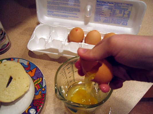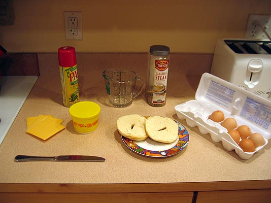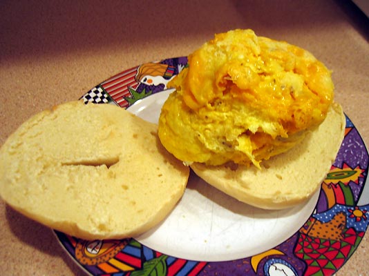 1) Turn the cup over and shake it a bit onto the bagel. Enjoy the sight of delicious cheesey puffy egg cheese egg puff.